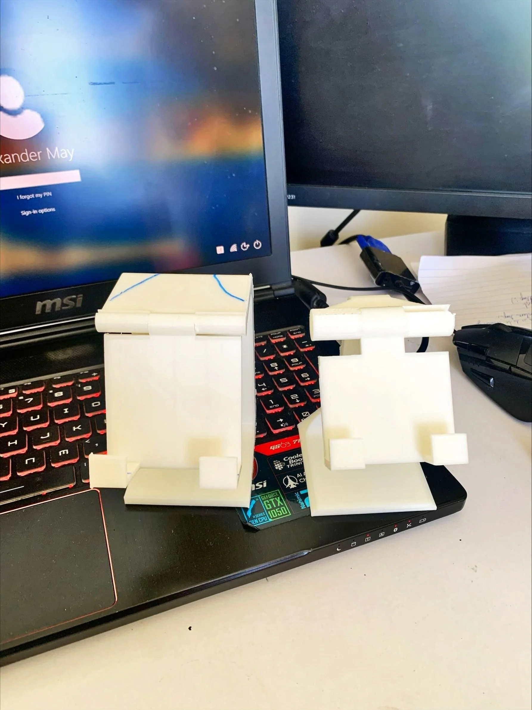 To make a well working phone stand requires a lot of experience in the matter, or, make improvements off a base design with user feedback until it’s working well enough. As I am no subject matter expert, I went with the second option. The design went through 8 different iterations, and the first problem to tackle was to have a something that allows it to change the angle the phone is held at. This involved a holder component connect to the rest of the stand with a pivot, and using either a support or friction to set/fix the angle to what the user wants. The second design requirement was to improve the speed of production, reducing the time it takes to make one Phone Stand, from the initial design of ~36 hours, down to ~12 hours halfway through the design process, to under 6 hours of the latest design. This vastly improves production rates of the Phone Stand, from .6 per day to 4 per day, all done by designing the phone stands to take advantage of the particularities of 3D printing, where it is much faster at printing wide and long, but much slower at printing with height, and design became more and more ‘flat’ through the process. These, along with having my own 3D printer, means that I was able to quickly learn these lessons and implement them, and further gaining more experience with designing for manufacture while still having a functional mechanism.